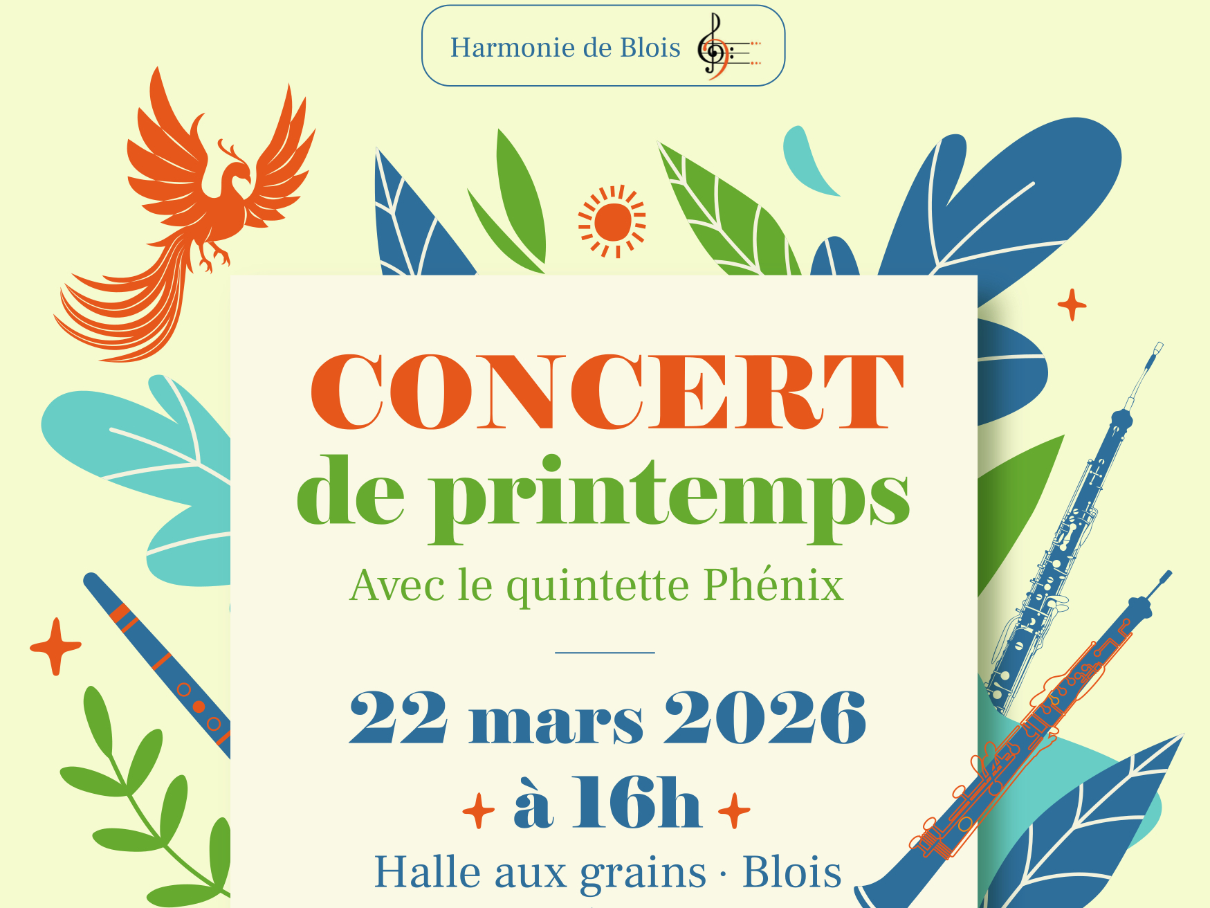 L'Harmonie de Blois vous propose son traditionnel concert de printemps le dimanche 22 mars à 16h. Vous aurez l'occasion de découvrir le Quintette Phenix que nous recevons pour partager ce moment musical avec vous. Nous vous recommandons d'acheter vos places à l'avance, via notre site internet (www.harmoniedeblois.fr) ou lors de notre prévente du samedi 14 mars entre 10h et midi dans nos locaux du 14 rue de la Paix (avec paiement en espèce, chèque ou carte bancaire). Les éventuelles places restantes seront mises en vente à l'ouverture des portes à 15h le jour du concert.