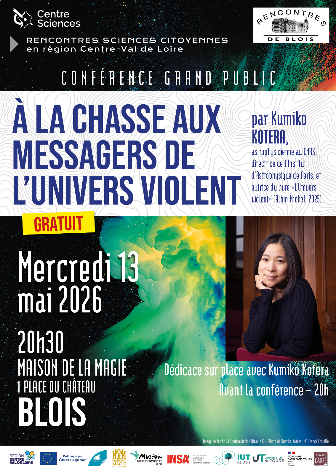 Un ciel immuable, piqueté de lumières douces qui guident nos pas depuis l’aube de l’humanité... Comme les observatoires modernes l’ont révélé, cette conception est erronée : l’Univers abrite nombre d’événements fugaces et imprévisibles, d’une violence inouïe. Longtemps, la seule preuve fut d’étranges "étoiles invitées" qui s’allumaient soudain, quelquefois par millénaire. Véritables paparazzis du cosmos, les astronomes capturent aujourd’hui d’éphémères supernovae, pulsars, coalescences de trous noirs, sursauts gamma, etc. Sources d’une extraordinaire quantité d’énergie, ils libèrent de la lumière, mais aussi des rayons cosmiques, des neutrinos ou encore ces ondes gravitationnelles que nous détectons depuis peu. Dans cette conférence, nous partirons à l’exploration de ce nouveau champ de recherche : l’Univers violent et la chasse à ses multi-messagers. Ce faisant, sera contée l’aventure collective du projet GRAND (Giant Radio Array for neutrino Detection), qui cherche à détecter ces particules grâce à des dizaines de milliers d’antennes déployées dans le désert de Gobi et la pampa argentine. Une conférence par Kumiko Kotera, astrophysicienne au CNRS, directrice de l’Institut d’Astrophysique de Paris, et autrice du livre "L'Univers violent" (Albin Michel, 2025). Chasseuse de neutrinos, elle est à la tête d’un ambitieux projet international, le Giant Radio Array for Neutrino Detection (GRAND). Conférence grand public ouverte à tous et gratuite dans le cadre des Rencontres de Blois. La conférence débutera à 20h30 et sera précédée d’une séance de dédicace avec Kumiko Kotera sur place dès 20h.