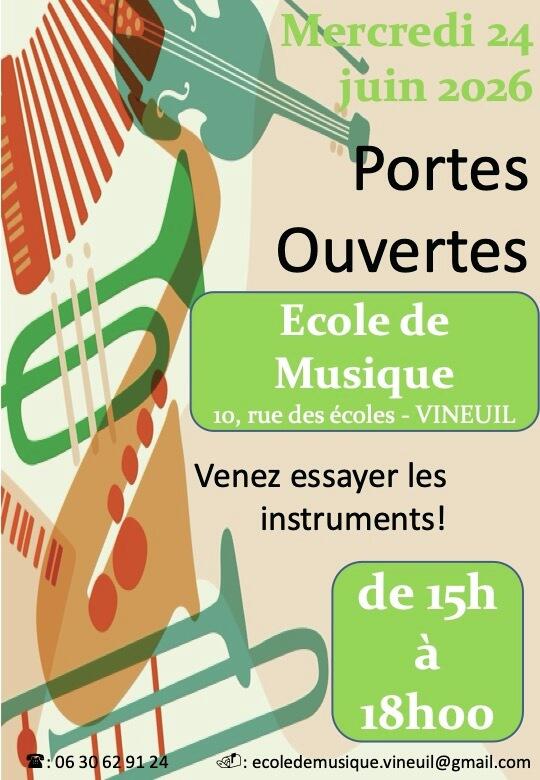 Un mercredi portes ouvertes avec découverte et essai des instruments est organisé mercredi 24 juin 2026 de 15h à 18h